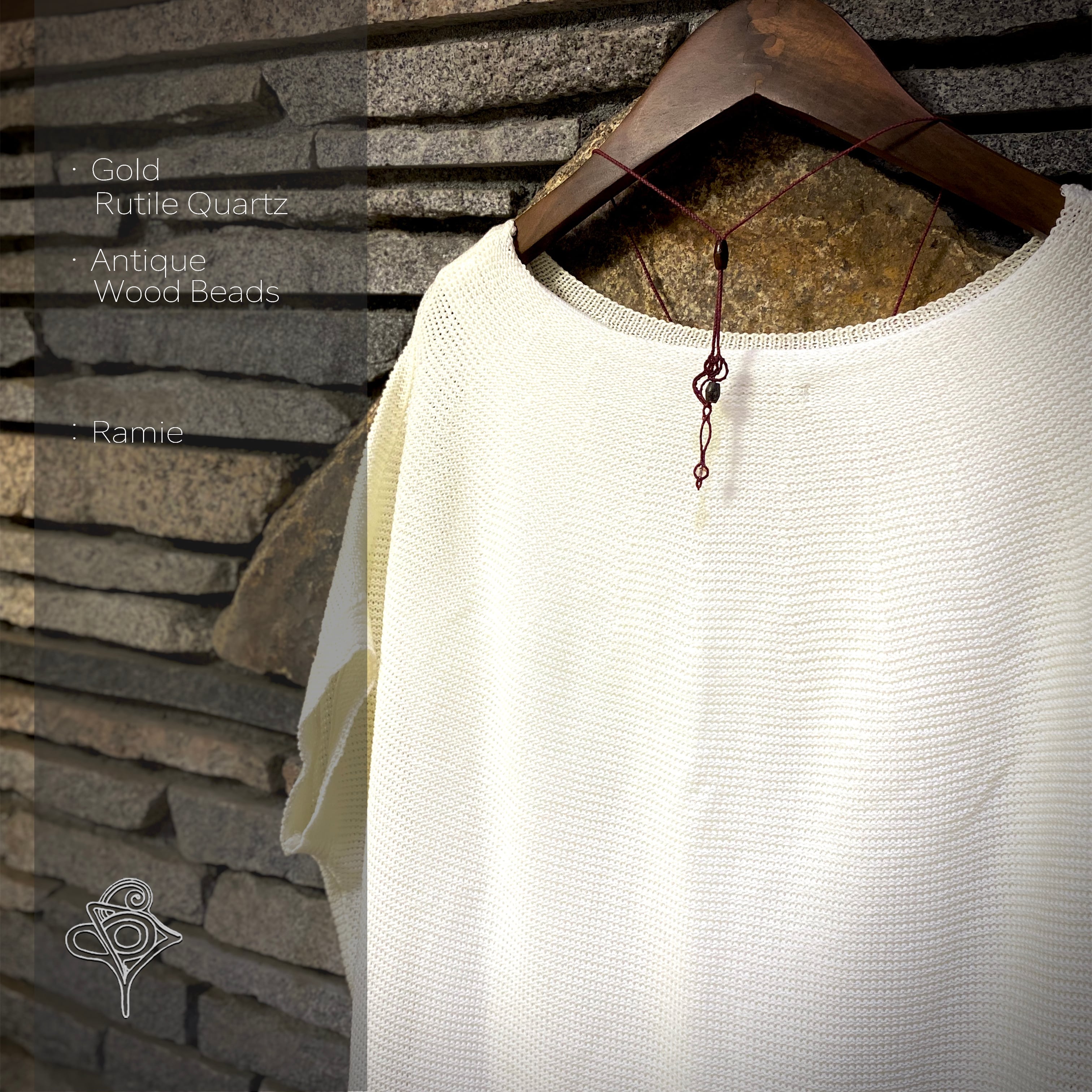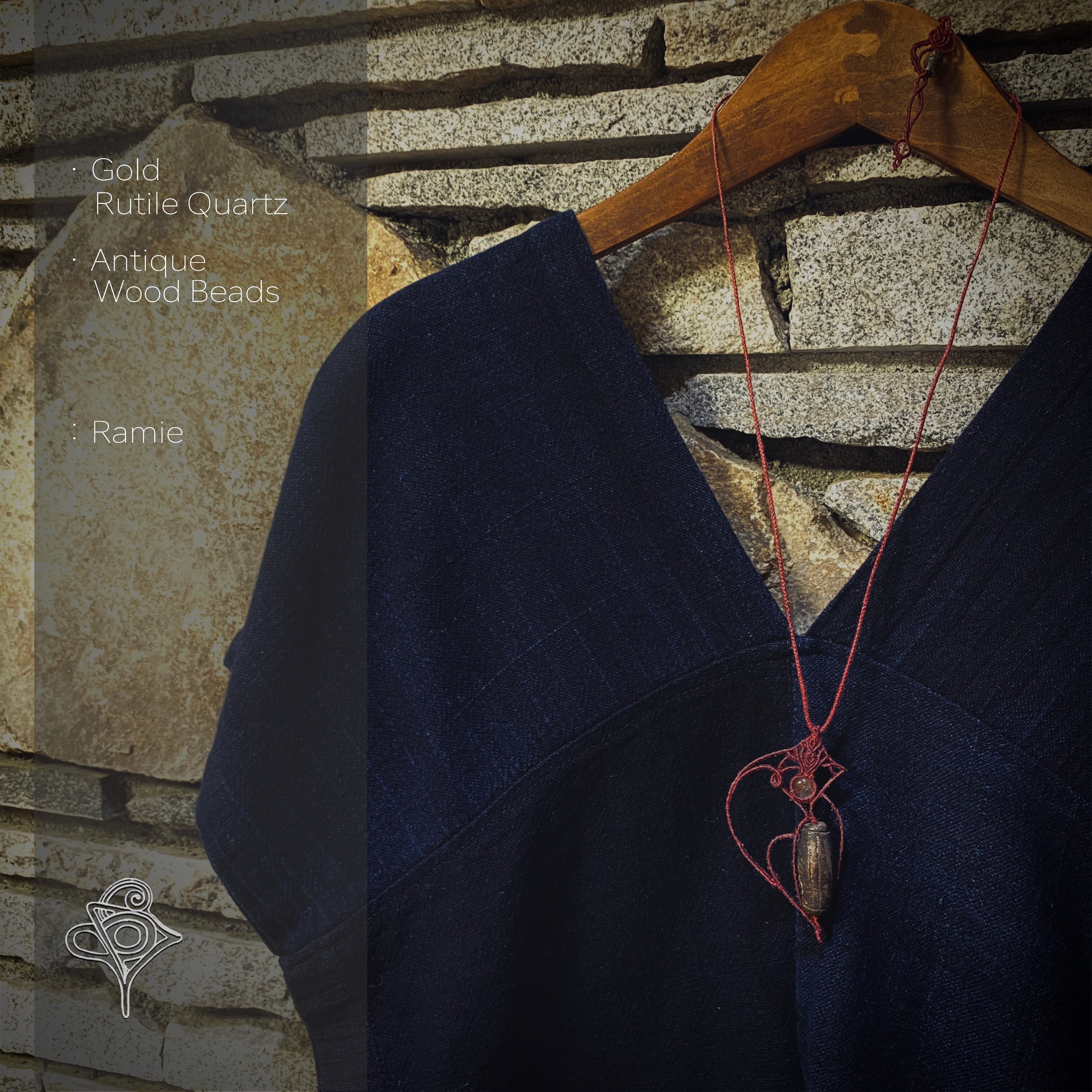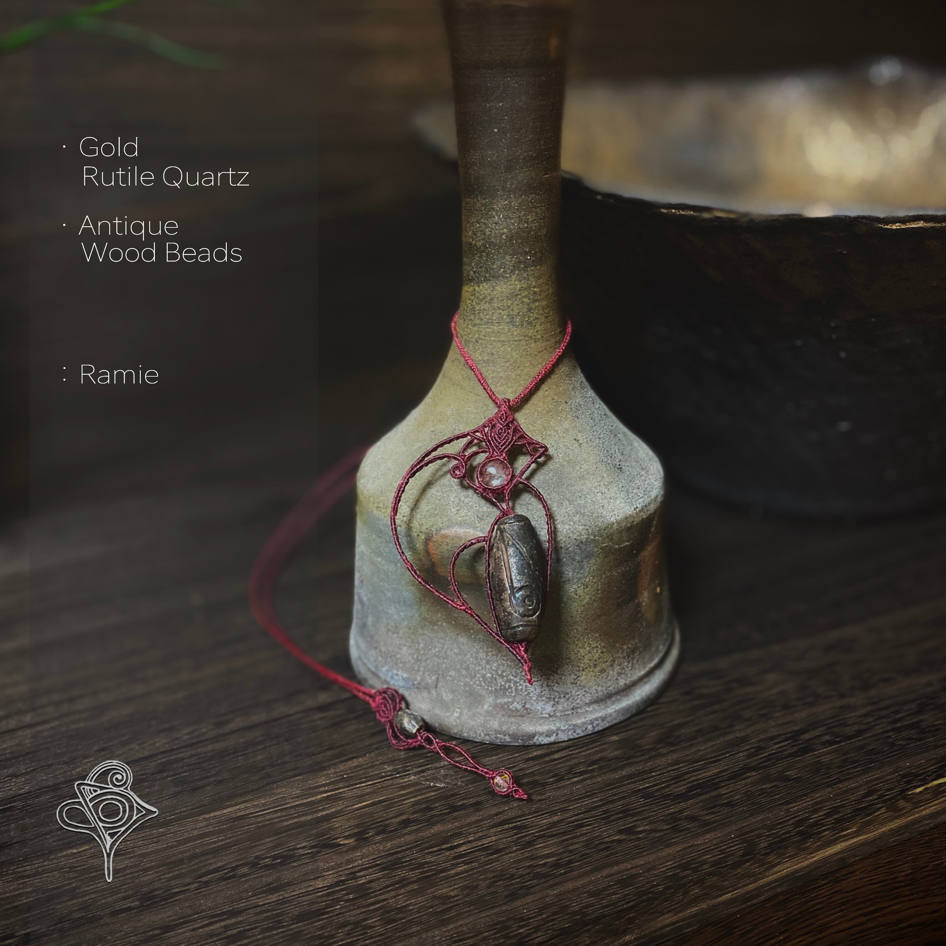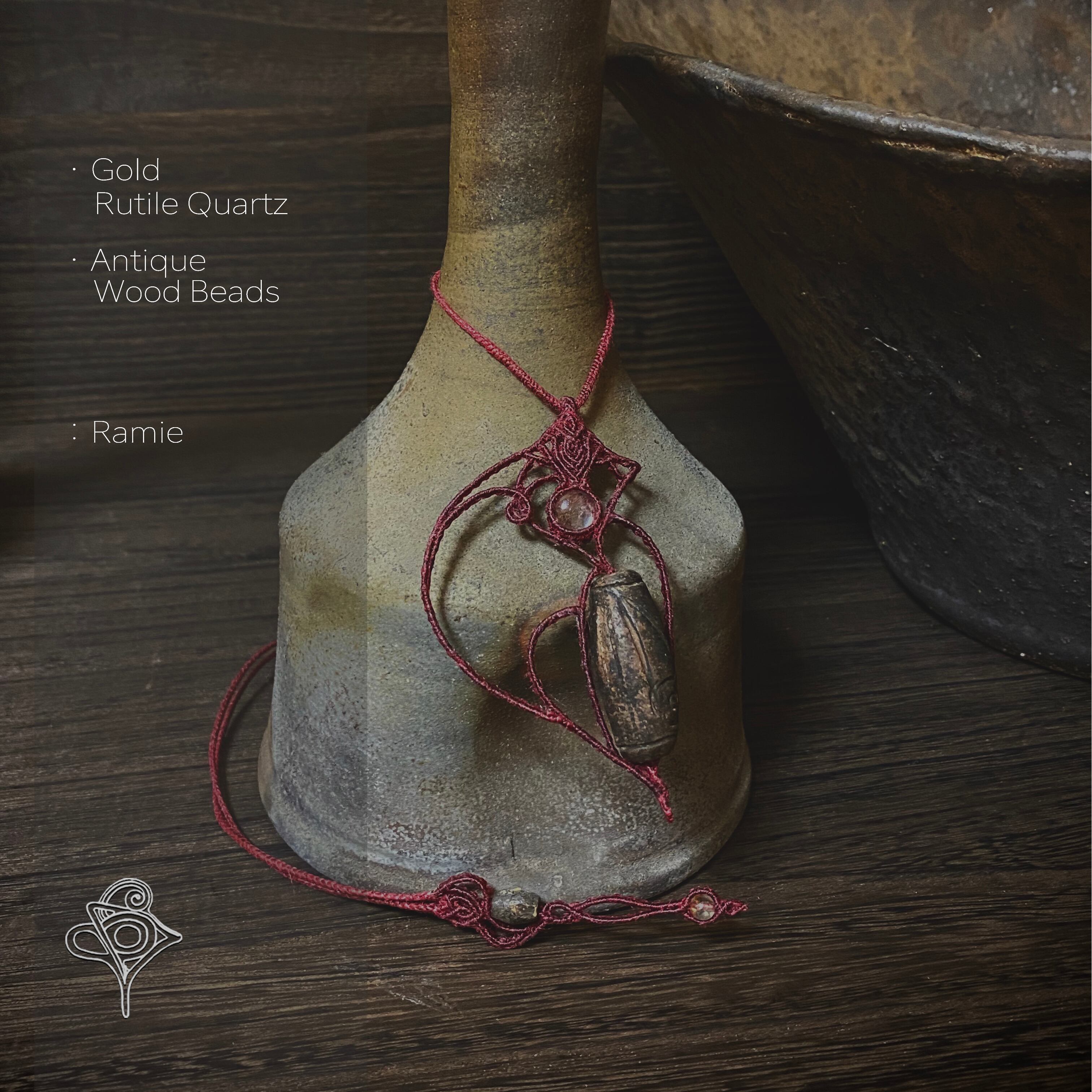" 循環 " / Gold Rutile Quartz, アンティークWood / 苧麻Ramie / Necklace